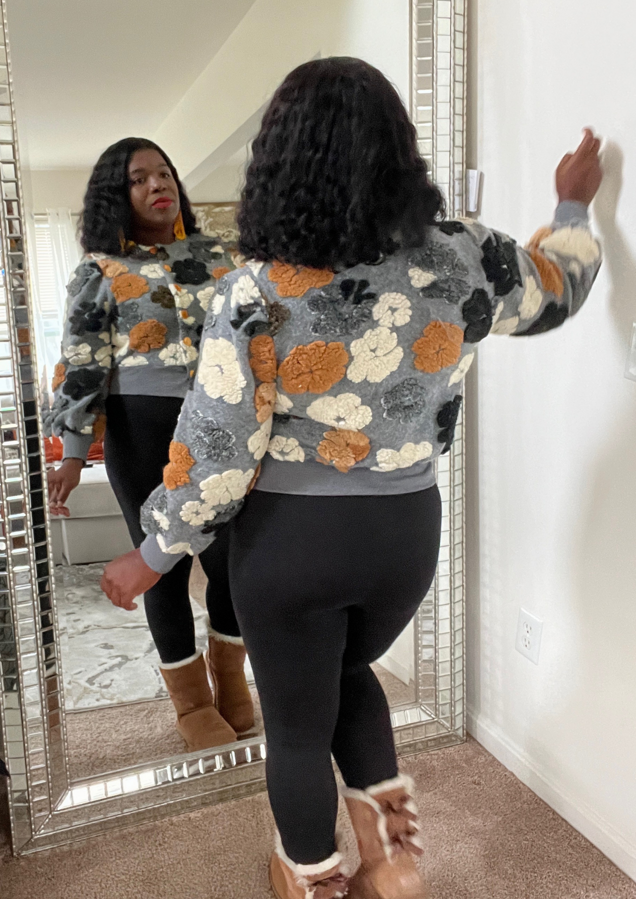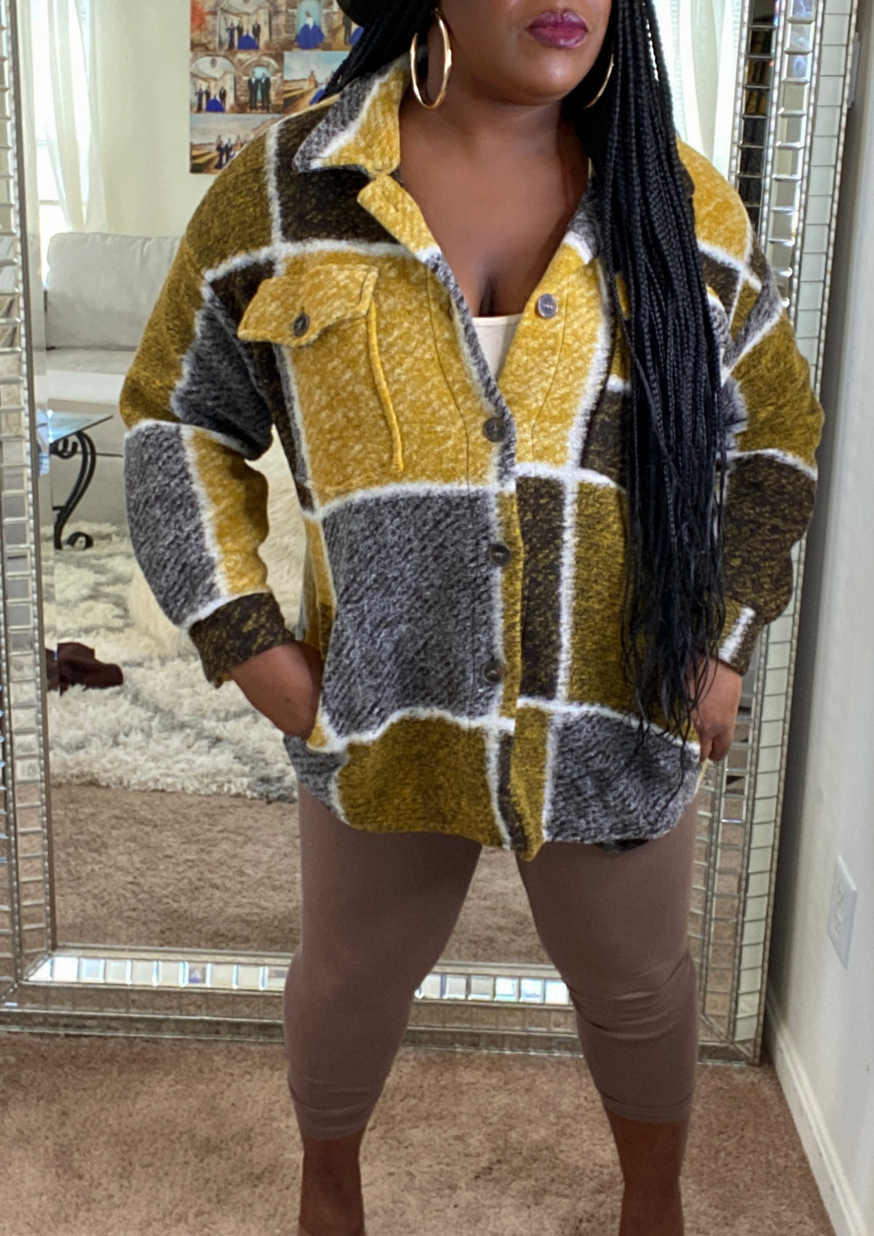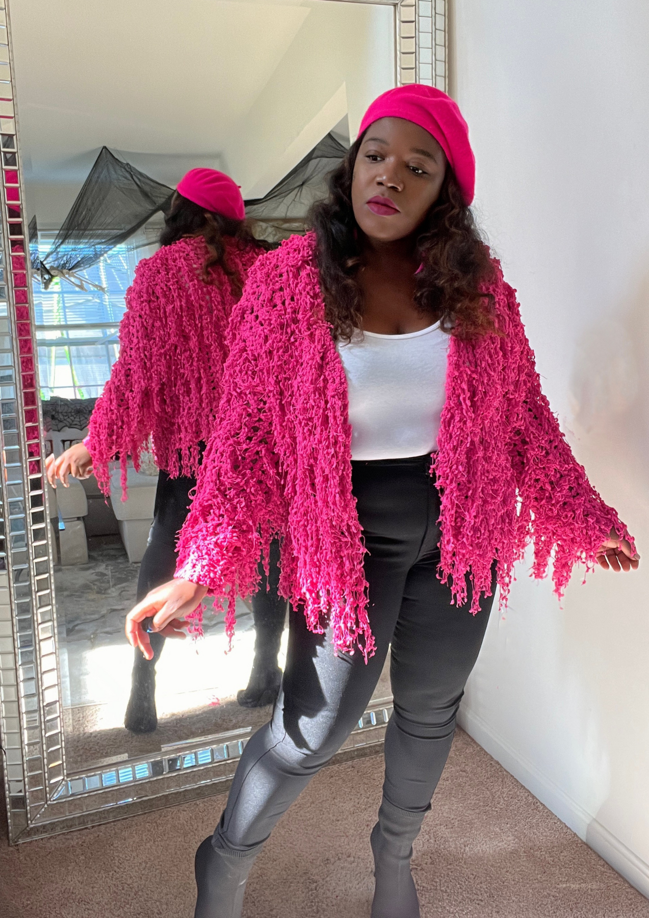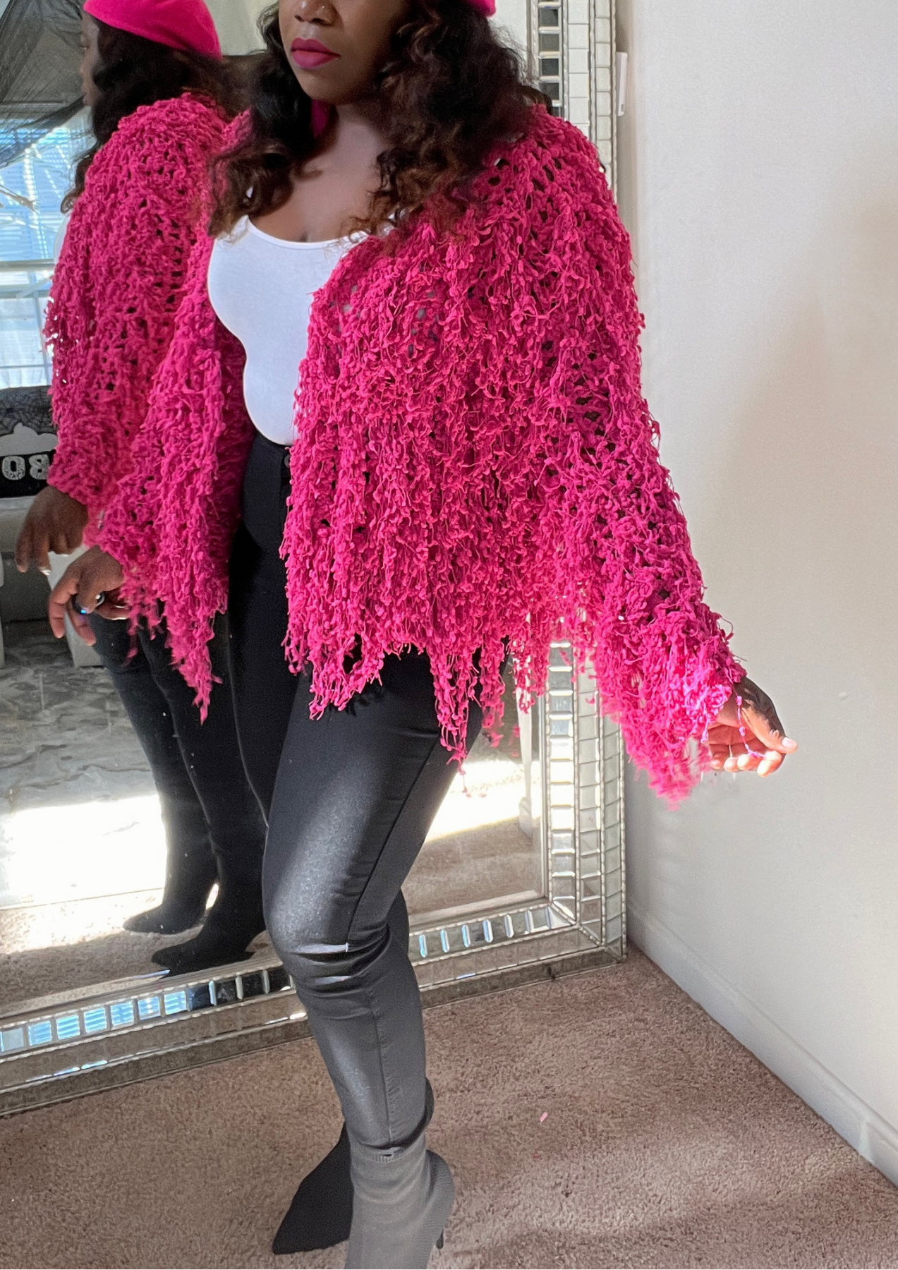 This jacket is just beautiful. Definitely add one to your closet ( Available in 3 colors). A statement piece. Just put it on pair with your fave shoes and you're ready to go. The jacket is light weight. You can layer this with a long sleeve top. Not itchy on skin. Very soft, comfortable, can be worn as outfit and kept on the entire time.
