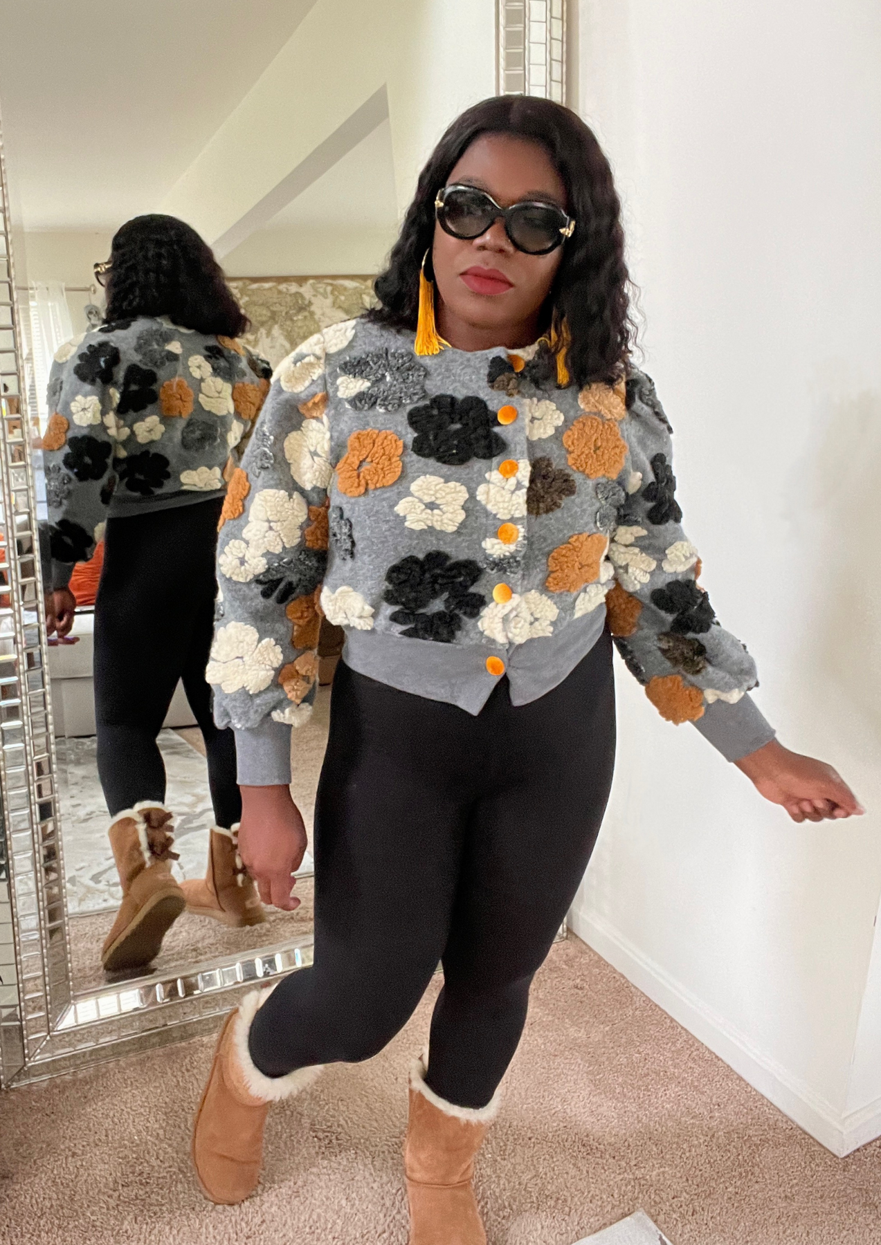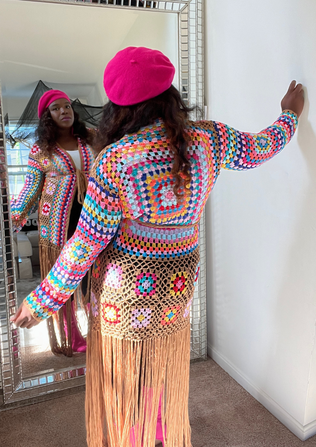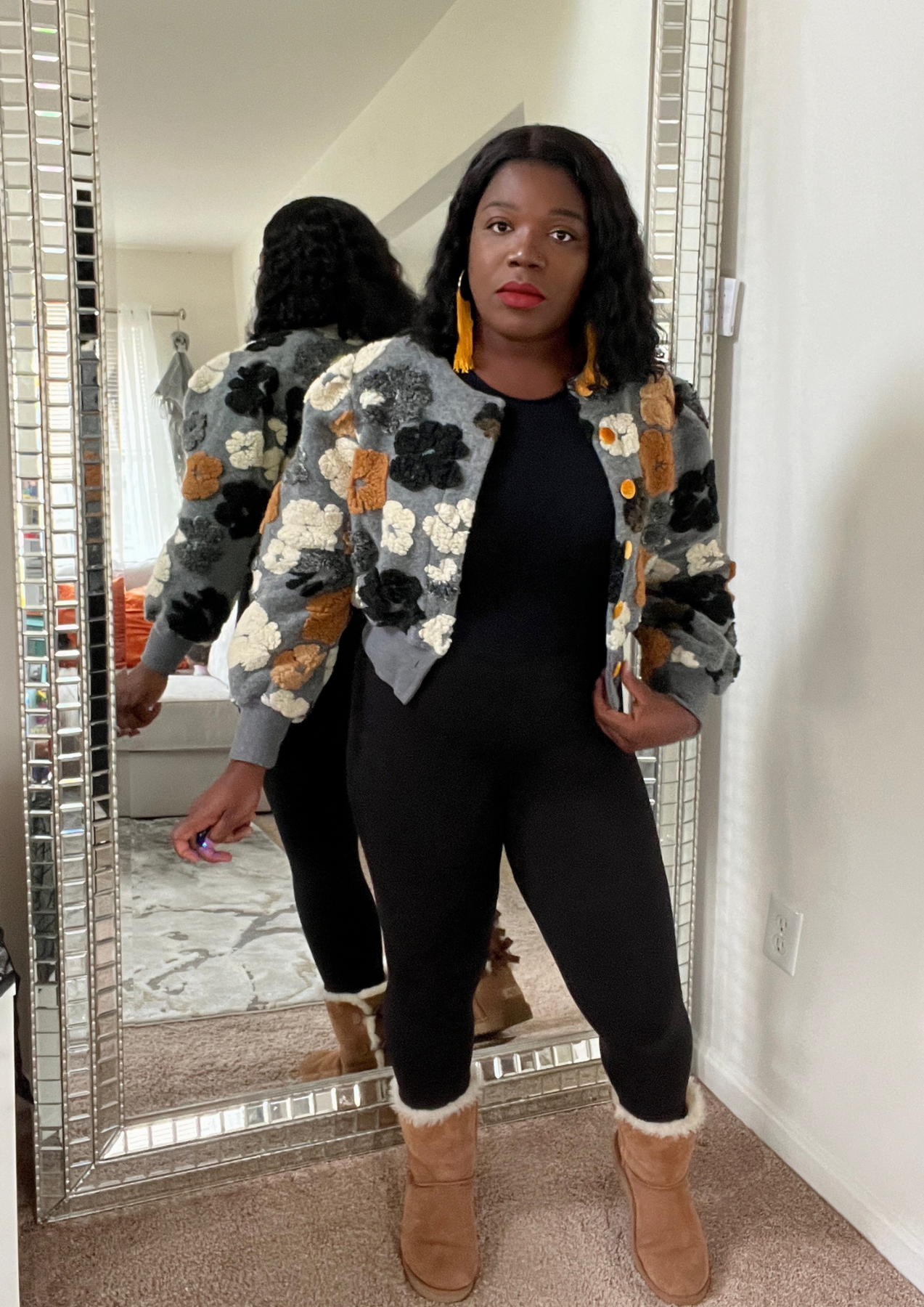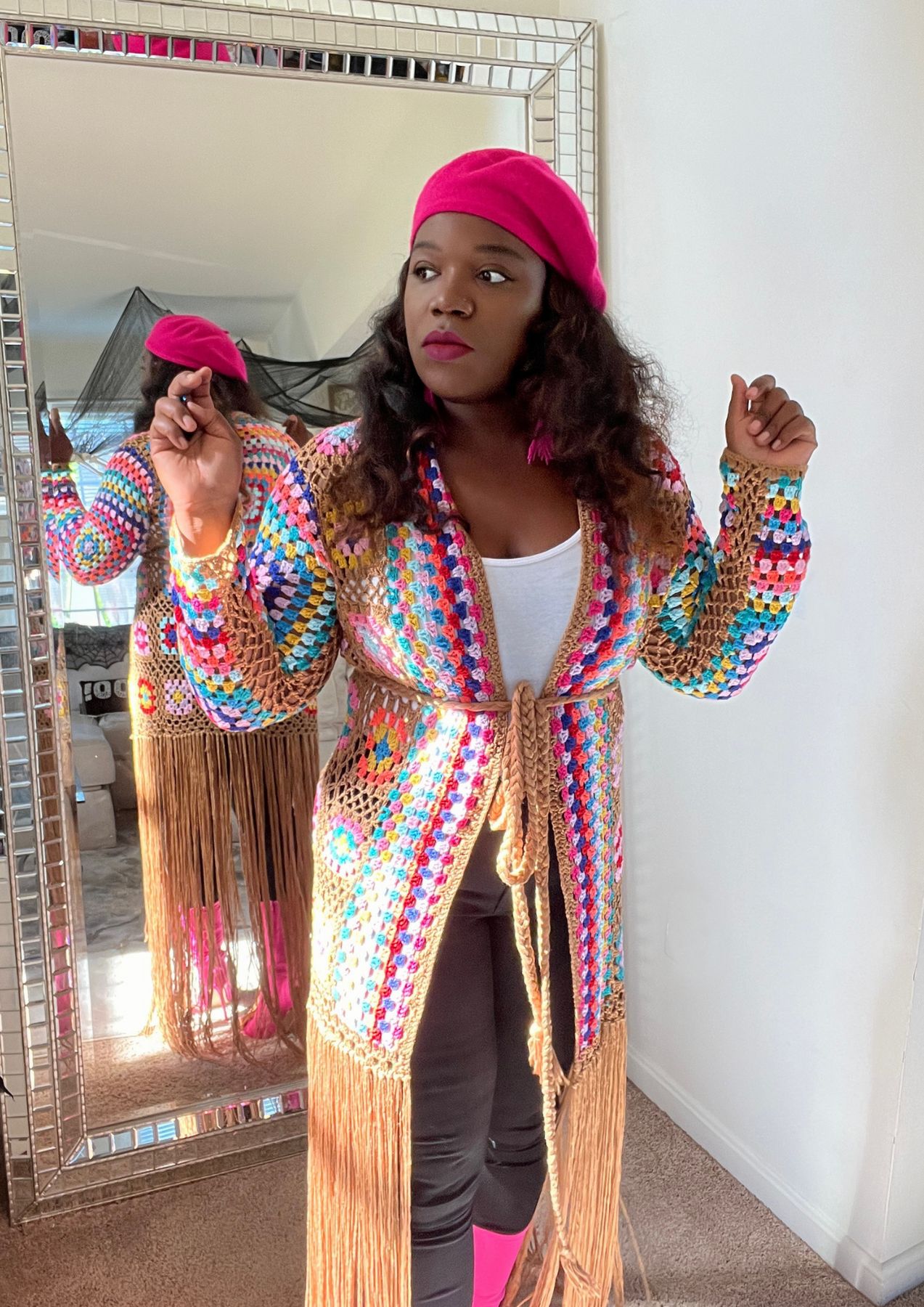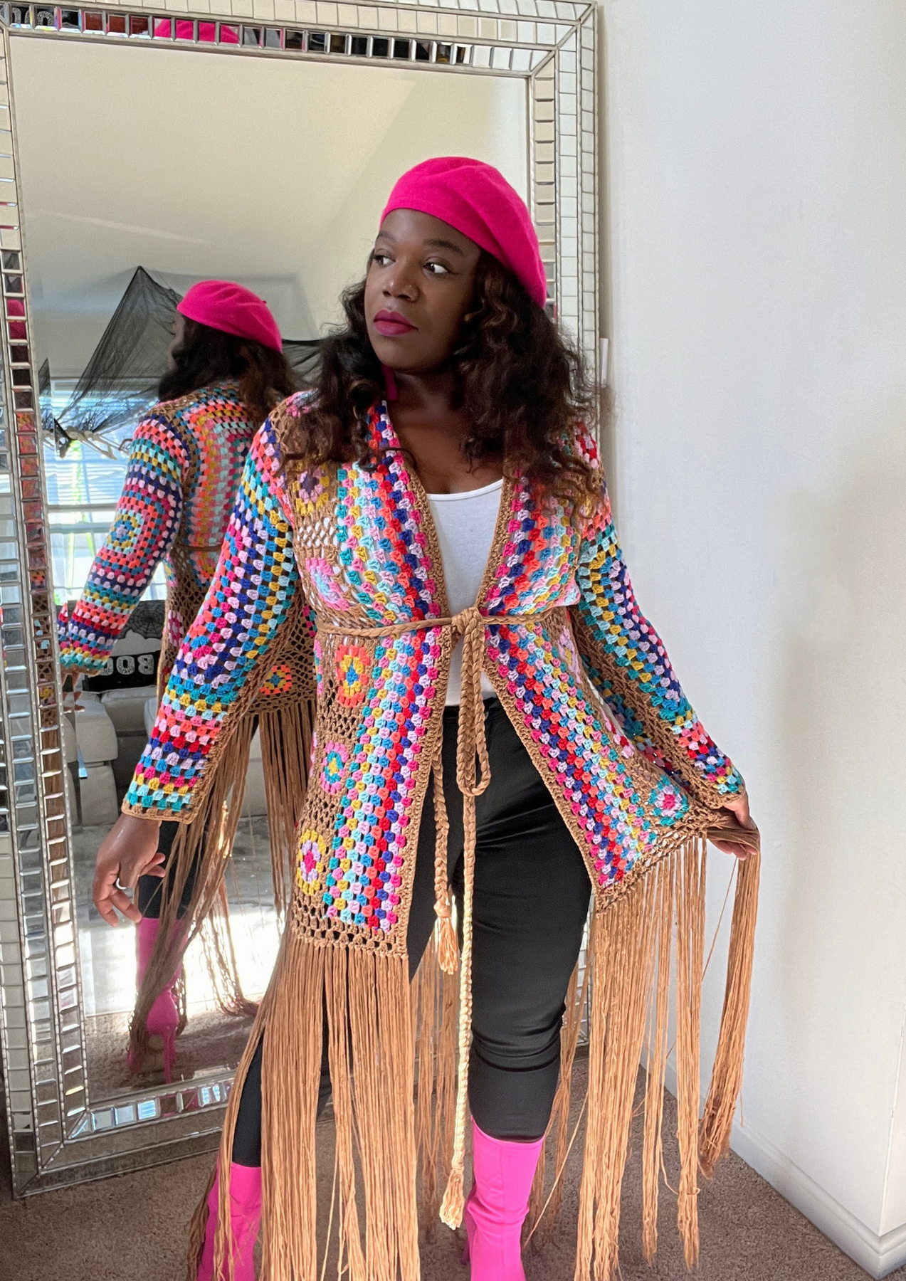 This jacket is just beautiful. Definitely add one to your closet ( Available in 3 colors). A statement piece. Just put it on pair with your fave shoes and you're ready to go. The jacket is light weight. You can layer this with a long sleeve top. Not itchy on skin. Very soft, comfortable, can be worn as outfit and kept on the entire time.