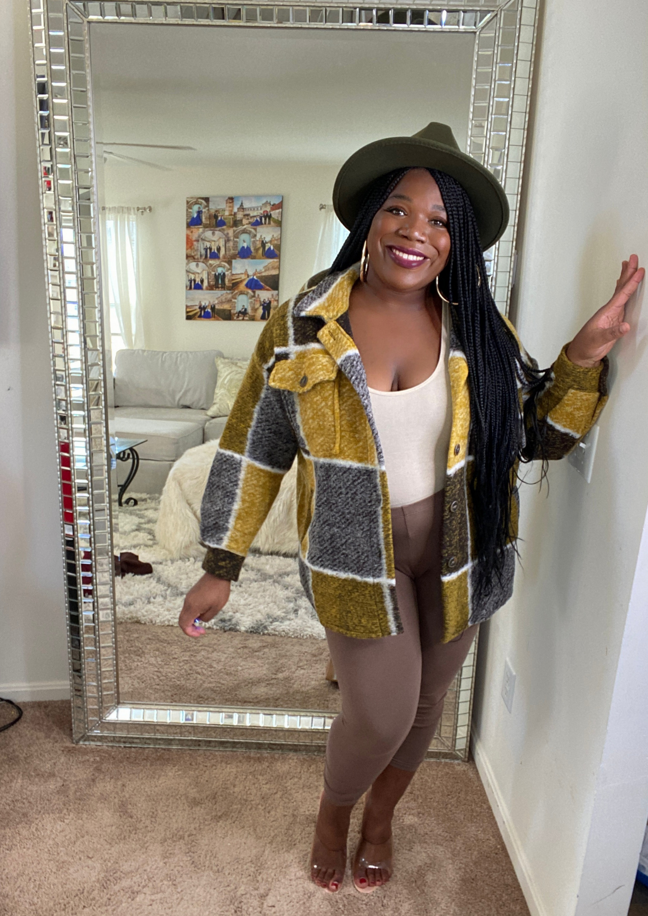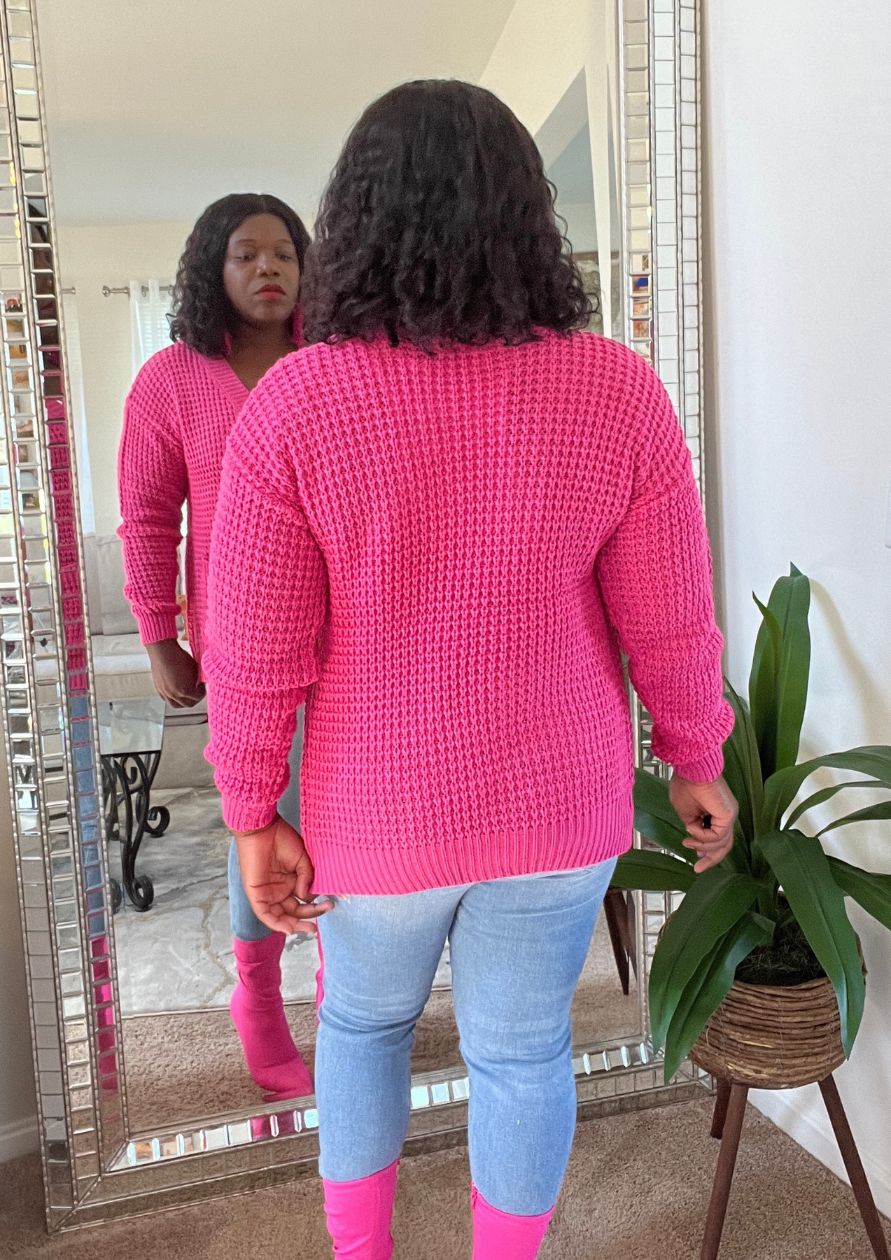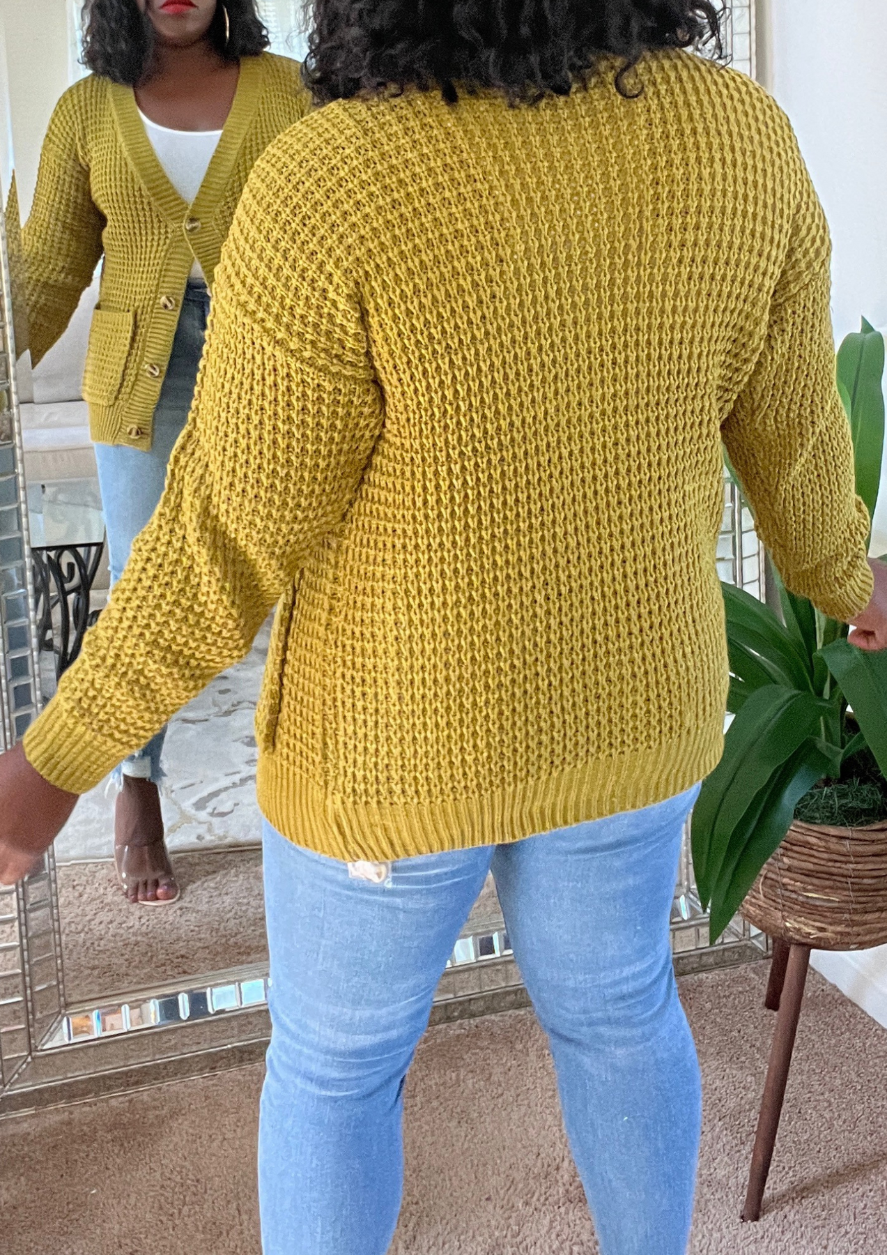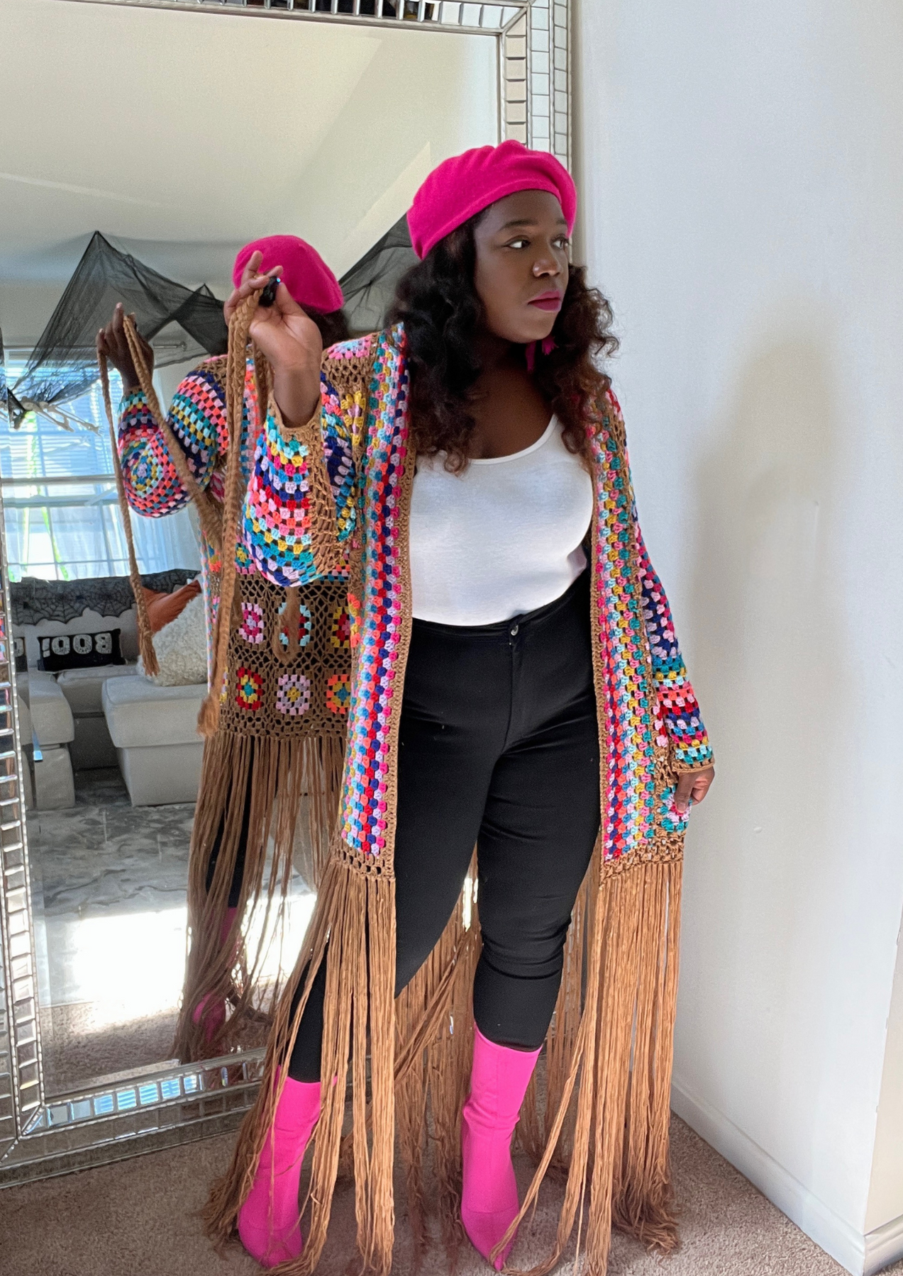 This jacket is just beautiful. Definitely add one to your closet ( Available in 3 colors). A statement piece. Just put it on pair with your fave shoes and you're ready to go. The jacket is light weight. You can layer this with a long sleeve top. Not itchy on skin. Very soft, comfortable, can be worn as outfit and kept on the entire time.