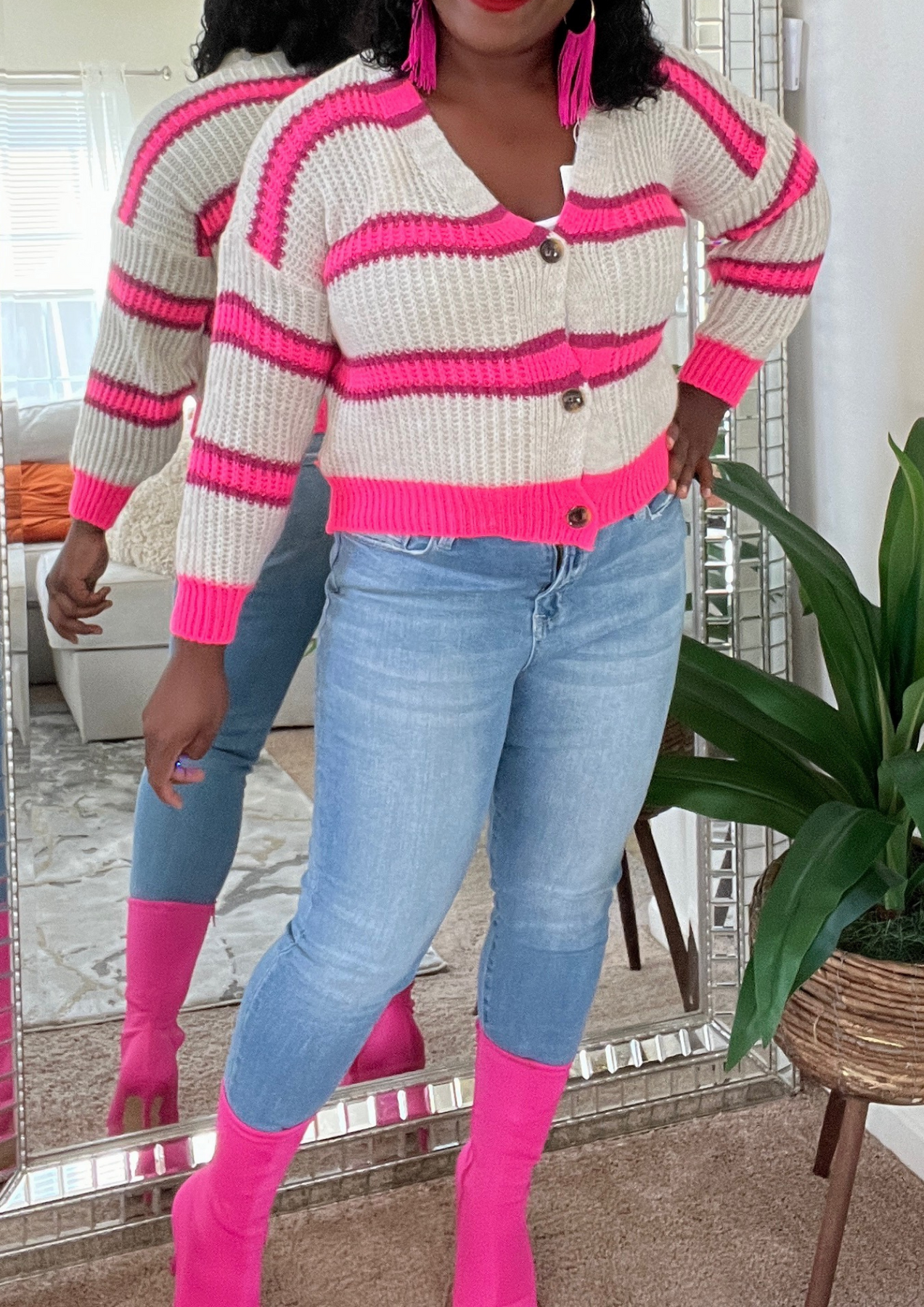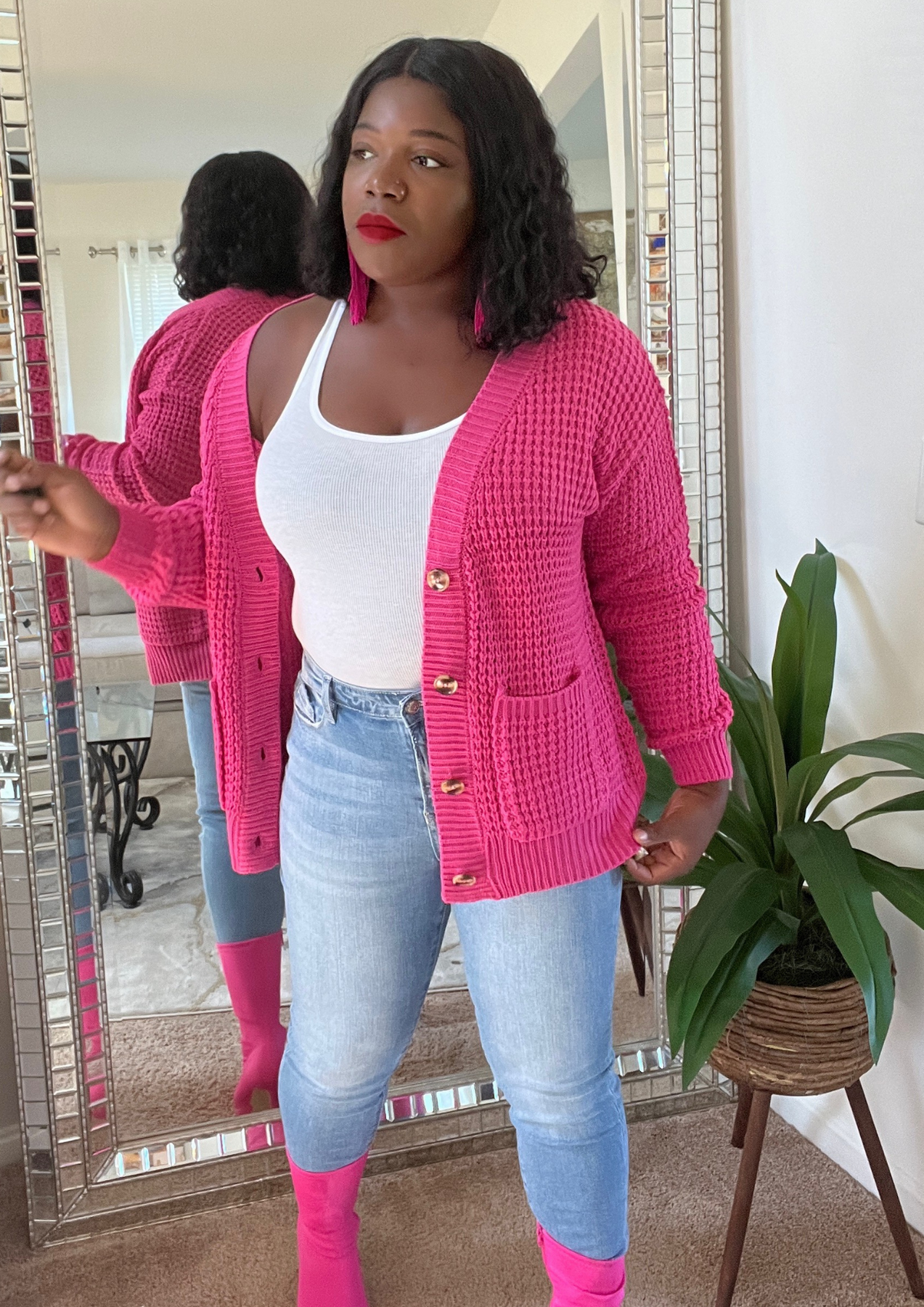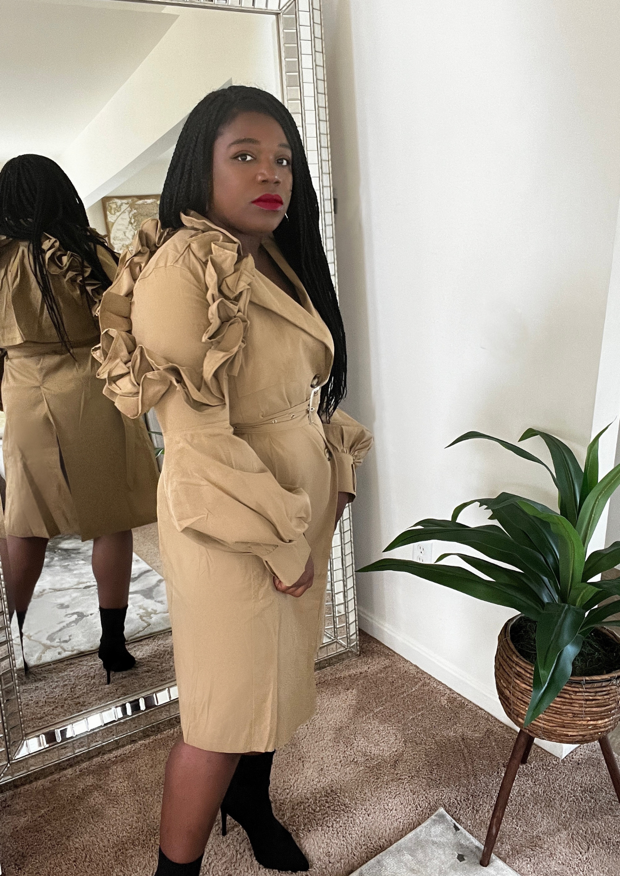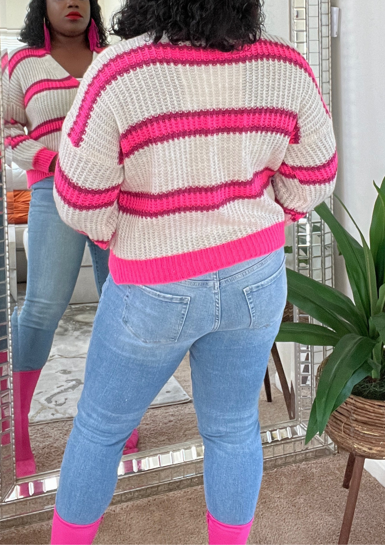 This jacket is just beautiful. Definitely add one to your closet ( Available in 3 colors). A statement piece. Just put it on pair with your fave shoes and you're ready to go. The jacket is light weight. You can layer this with a long sleeve top. Not itchy on skin. Very soft, comfortable, can be worn as outfit and kept on the entire time.