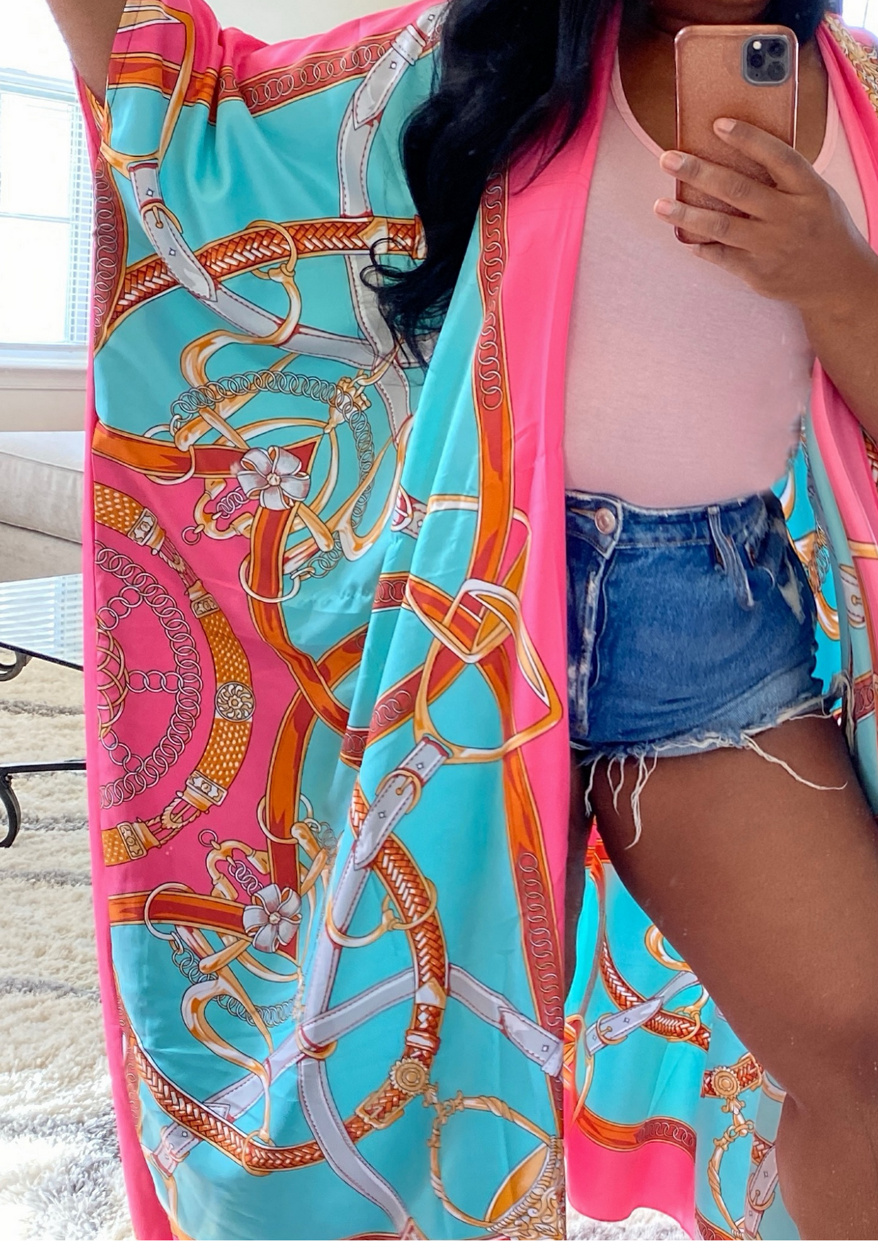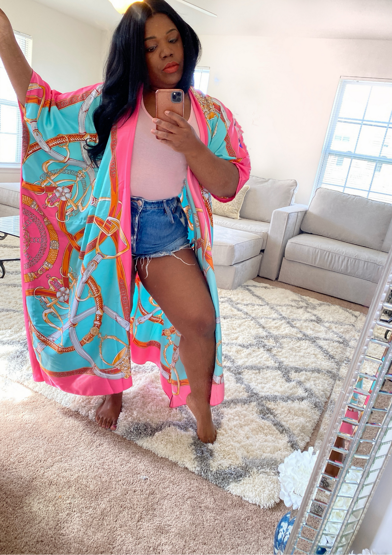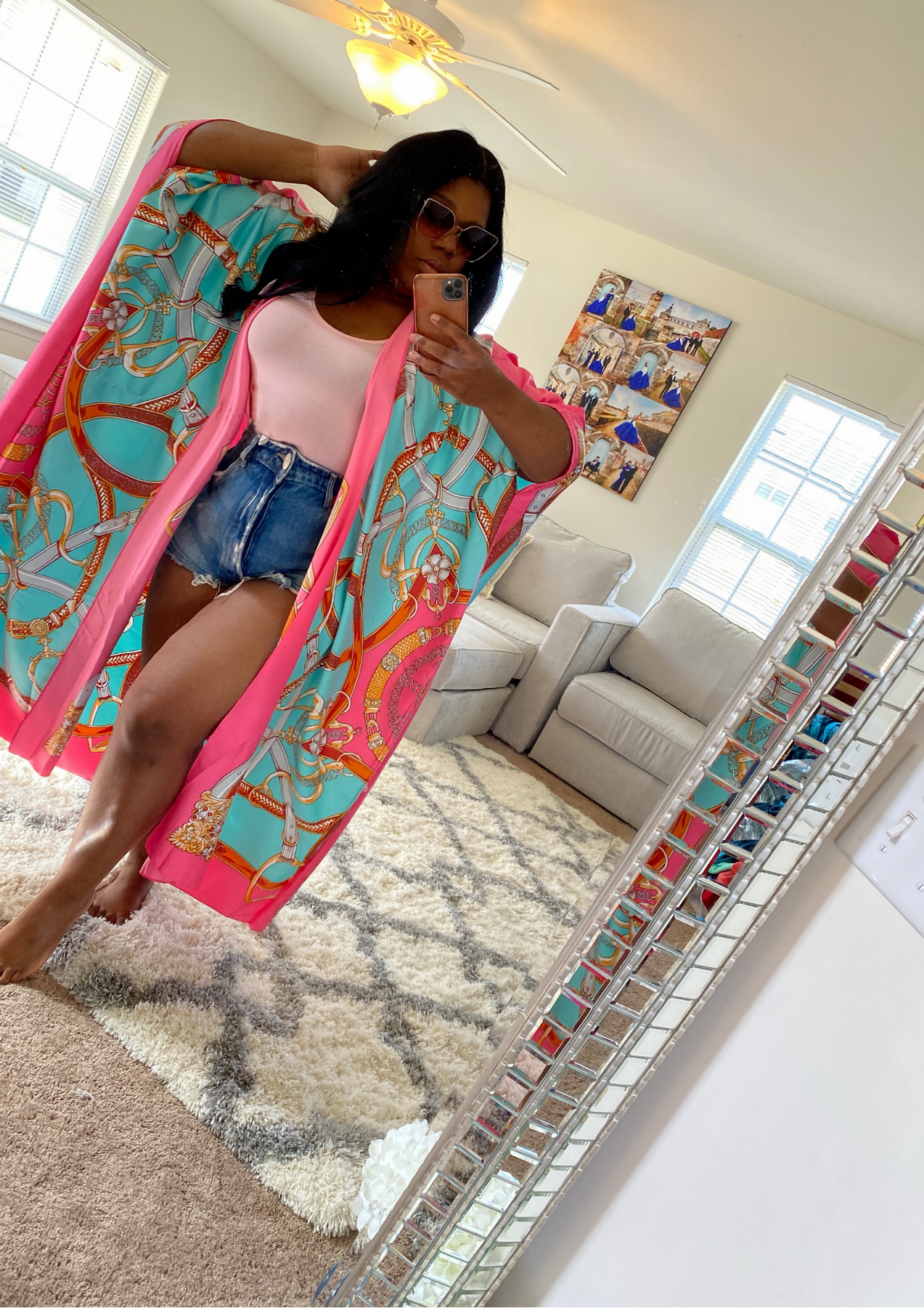 Trae M This Kimono is definitely a keeper. The colors are pretty and material is nice. The pink isn't as bright as I thought, but nonetheless you won't be disappointed. Shipping is fast. I love this boutique. 💕